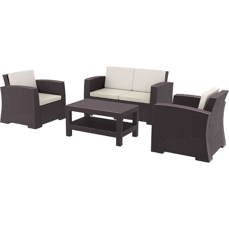 SET MONACO K/D του οίκου Siesta, σε χρώμα brown. Το SET περιλαμβάνει 1 2θέσιο καναπέ, 2 πολυθρόνες, τραπέζι και μαξιλάρια. Από υψηλής ποιότητας πολυπροπυλένιο με ενίσχυση από υαλώδεις ίνες (fiber glass) για απόλυτη αντοχή. Χωρίς μεταλλικό σκελετό για μεγαλύτερη αξιοπιστία στον χρόνο. Διαθέτει UV protection για μέγιστη προστασία από τον ήλιο ώστε να μην αλλοιωθούν τα χρώματα. Κατάλληλο για εσωτερική και εξωτερική χρήση. Πιστοποιημένο προϊόν από τον Ιταλικό οίκο CATAS.