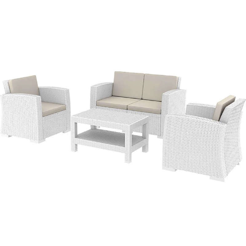 SET MONACO K/D του οίκου Siesta, σε χρώμα white. Το SET περιλαμβάνει 1 2θέσιο καναπέ, 2 πολυθρόνες, τραπέζι και μαξιλάρια. Από υψηλής ποιότητας πολυπροπυλένιο με ενίσχυση από υαλώδεις ίνες (fiber glass) για απόλυτη αντοχή. Χωρίς μεταλλικό σκελετό για μεγαλύτερη αξιοπιστία στον χρόνο. Διαθέτει UV protection για μέγιστη προστασία από τον ήλιο ώστε να μην αλλοιωθούν τα χρώματα. Κατάλληλο για εσωτερική και εξωτερική χρήση. Πιστοποιημένο προϊόν από τον Ιταλικό οίκο CATAS.