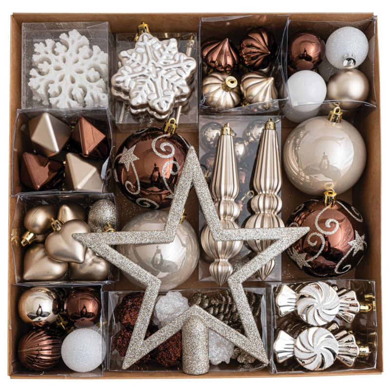 Σέτ 98 Τεμαχίων Καφέ Λευκά Σαμπανί Διακοσμητικά Στολίδια 3-12cm Και Κορυφή 20cm